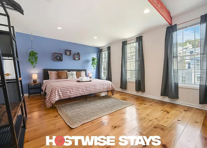 La villa Hostwise Stays - The "Row" House - Beautiful Space, Two King Beds ofrece acceso a una cocina bien equipada provista de lavaplatos, cafetera/tetera y un horno. Los huéspedes pueden cenar en el restaurante Legends Eatery, situado a unos 600 metros. El aeropuerto Internacional de Pittsburgh está a 30 km del establecimiento, y la parada de autobús East Ohio St at Cedar Ave está a unos 10 minutos a pie.